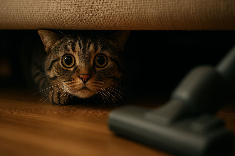 猫にとって、これらの音は「命の危険」を直接的に感じさせるシグナルです。だからこそ、本能的に「安全な場所へ隠れろ!」という指令が脳から出て、一目散にベッドの下やクローゼットの奥へと逃げ込んでしまうのです。