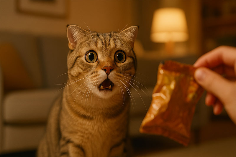 4. 猫の脳内で、「ガサガサ音」と「美味しいおやつ」が強く結びつきます。
